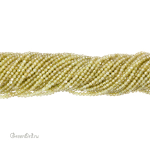 Бусины Циркон (фианит или кубический цирконий) ювелирной огранки. Материал: синтетический камень. Цвет: светло-зелёный (прозрачный). Размер: 2 х 1,9 мм, диаметр отверстия: 0,5 мм. Производство: Китай. Цена указана за нить 37-38 см (примерно 204 штуки).