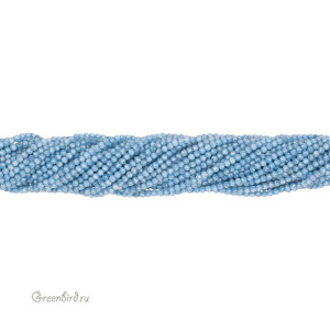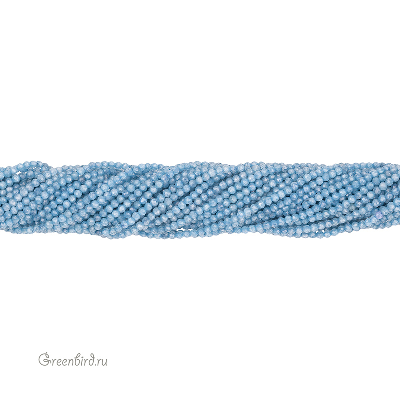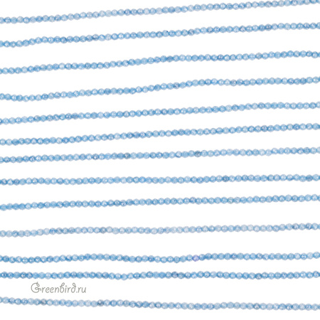 Бусины Циркон (фианит или кубический цирконий) ювелирной огранки. Материал: синтетический камень. Цвет: голубой (полупрозрачный). Размер: 2 мм, диаметр отверстия: 0,5 мм. Производство: Китай. Цена указана за нить 37-38 см (примерно 188-190 штук).