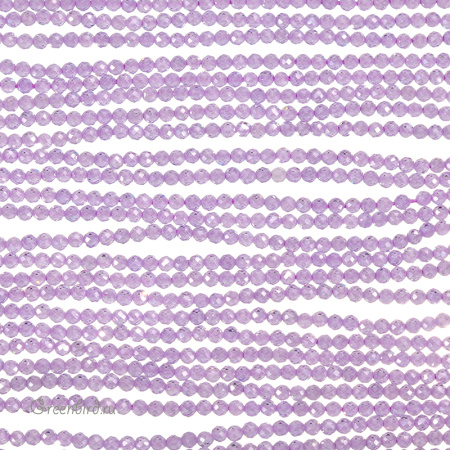 Бусины Циркон (фианит или кубический цирконий) ювелирной огранки. Материал: синтетический камень. Цвет: сиреневый (прозрачный). Размер: 2 х 1,9 мм, диаметр отверстия: 0,5 мм. Производство: Китай. Цена указана за нить 37-38 см (примерно 204 штуки).