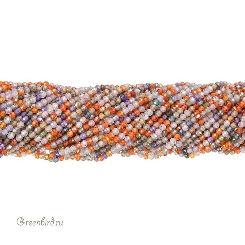 Бусины Циркон (фианит или кубический цирконий) ювелирной огранки. Материал: синтетический камень. Цвет: разноцветный (прозрачный). Размер: 2 х 1,9 мм, диаметр отверстия: 0,5 мм. Производство: Китай. Цена указана за нить 37-38 см (примерно 204 штуки).