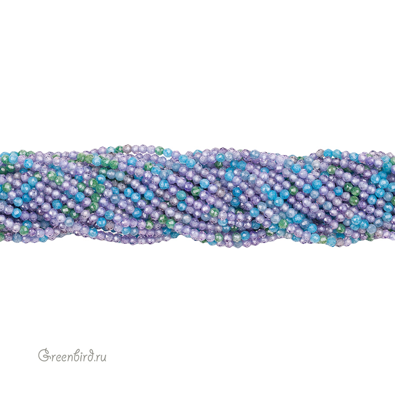 Бусины Циркон (фианит или кубический цирконий) ювелирной огранки. Материал: синтетический камень. Цвет: сиренево-голубой микс (прозрачный). Размер: 3 мм, диаметр отверстия: 0,5 мм. Производство: Китай. Цена указана за нить 37-38 см (примерно 125-128 штуки).