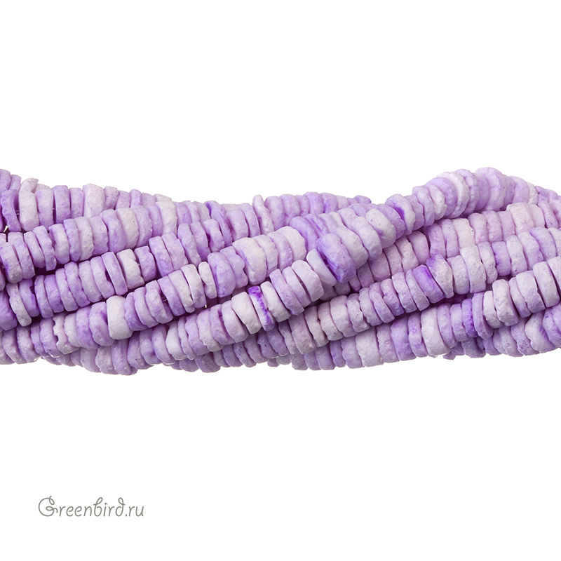 Бусины из натурального ракушечника в форме дисков. Цвет: сиреневый. Размер: 5-6,5 мм, толщина: 1,4-2,8 мм, отверстие: 0,9-1 мм. Обратите внимание: покрытие не устойчивое. Избегайте сильного трения и контакта с водой. Из-за природных особенностей материала размеры и оттенки бусин могут незначительно отличаться. Цена указана за нить 38 см (примерно 200 штук).