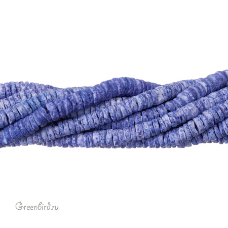 Бусины из натурального ракушечника в форме дисков. Цвет: синий. Размер: 5-6,5 мм, толщина: 1,4-2,8 мм, отверстие: 0,9-1 мм. Обратите внимание: покрытие не устойчивое. Избегайте сильного трения и контакта с водой. Из-за природных особенностей материала размеры и оттенки бусин могут незначительно отличаться. Цена указана за нить 38 см (примерно 200 штук).