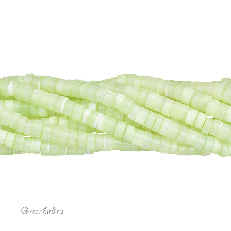 Бусины из натурального окрашенного перламутра в форме диска. Цвет: салатовый, с белыми прожилками и переливами. Размер примерно: 4,5 мм, толщина: 1,7 - 2 мм, отверстие: 0,6 мм - 1 мм. Обратите внимание: из-за природных особенностей материала размеры и оттенки бусин могут незначительно отличаться. Так же возможны неровности на краях и поверхности бусин, которые могут выглядеть как сколы или вмятины. Такие эффекты не считаются браком и являются прямым следствием природного происхождения исходного материала (эти бусины сделаны из раковин моллюсков). Покрытие не устойчивое. Избегайте сильного трения и контакта с водой. Цена указана за нить (примерно 220 штук).