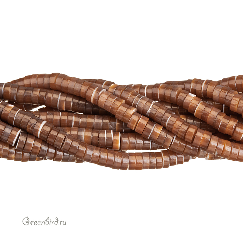 Бусины из натурального перламутра в форме диска. Цвет: коричневый с переливами, с белыми прожилками. Размер примерно: 4,5 мм, толщина: 1,7 - 2 мм, отверстие: 0,6 мм - 1 мм. Обратите внимание: из-за природных особенностей материала размеры и оттенки бусин могут незначительно отличаться. Так же возможны неровности на краях и поверхности бусин, которые могут выглядеть как сколы или вмятины. Такие эффекты не считаются браком и являются прямым следствием природного происхождения исходного материала (эти бусины сделаны из раковин моллюсков). Цена указана за нить (примерно 220 штук).