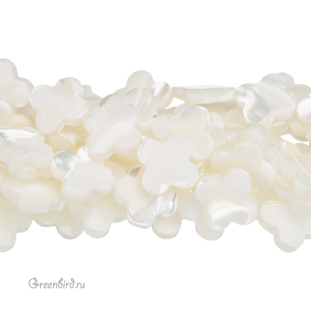 Бусины из натурального перламутра в форме клевера. Цвет: жемчужно-белый или рисовый с переливами. Возможны небольшие неровности и царапины естественного происхождения. Размер: примерно 12,3 мм, толщина: от 2,5 до 3,1 мм, отверстие: 0,6 - 0,7 мм. Из-за особенностей материала бусины незначительно отличаются по рисунку, вы получите бусину случайного вида. Цена указана за 1 шт.