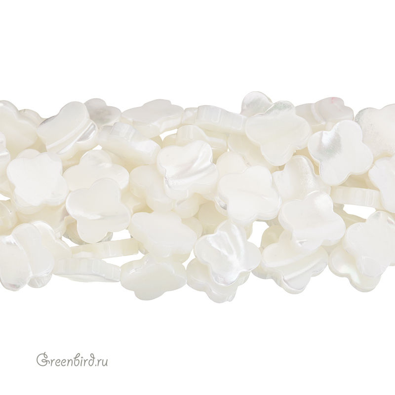Бусины из натурального перламутра в форме клевера. Цвет: жемчужно-белый или рисовый с переливами. Возможны небольшие неровности и царапины естественного происхождения. Размер: примерно 10,2 мм, толщина: от 2,3 до 2,7 мм, отверстие: 0,6 - 0,7 мм. Из-за особенностей материала бусины незначительно отличаются по рисунку, вы получите бусину случайного вида. Цена указана за 1 шт.