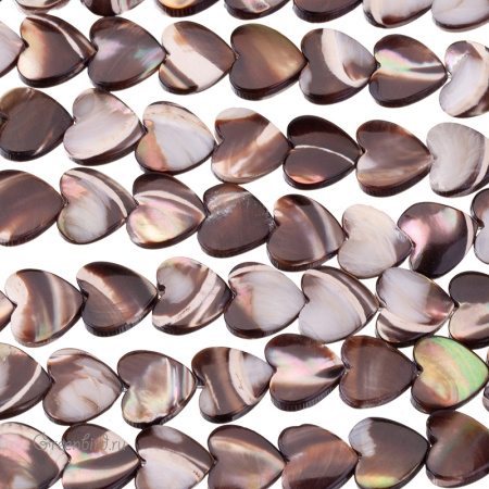 Бусины из натурального перламутра в форме сердца. Цвет: шоколадный с переливами, с белыми прожилками и вкраплениями. Размер: 10,3 х 10,4 мм, отверстие: 0,6 мм. Обратите внимание: из-за природных особенностей материала размеры и оттенки бусин могут незначительно отличаться. Так же возможны неровности на краях и поверхности бусин, которые могут выглядеть как сколы или вмятины. Такие эффекты не считаются браком и являются прямым следствием природного происхождения исходного материала (эти бусины сделаны из раковин моллюсков). Цена указана за нить (примерно 40 штук).