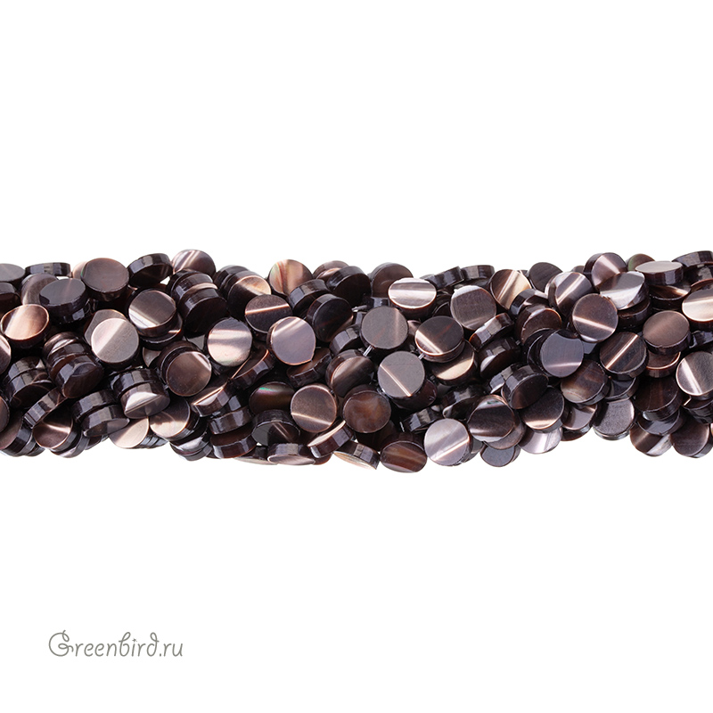 Бусины из натурального перламутра в форме таблеток. Цвет: шоколадный с переливами, с белыми прожилками и вкраплениями. Размер: 8,4 мм, толщина: 2,7 мм, отверстие: 0,6 мм. Обратите внимание: из-за природных особенностей материала размеры и оттенки бусин могут незначительно отличаться. Так же возможны неровности на краях и поверхности бусин, которые могут выглядеть как сколы или вмятины. Такие эффекты не считаются браком и являются прямым следствием природного происхождения исходного материала (эти бусины сделаны из раковин моллюсков). Цена указана за нить (примерно 46 штук).