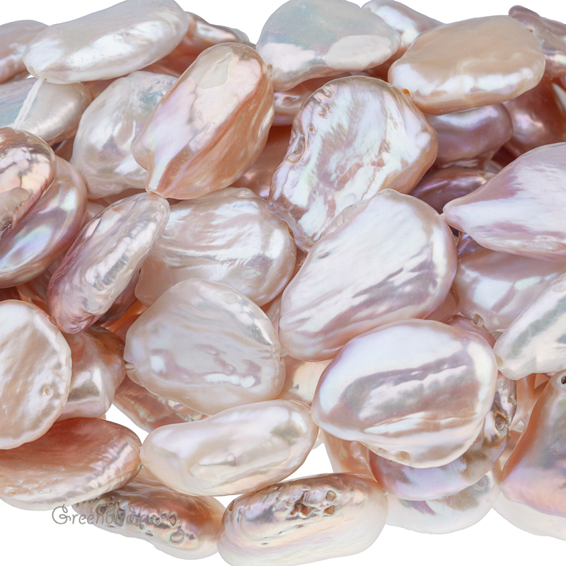 Жемчуг пресноводный культивированный (выращенный). Объемный, умеренно складчатый барочный жемчуг сложной формы (в основе – круглые заготовки), иногда с выраженной текстурой. Может иметь мелкие каверны и пятна. Размер примерно от 19 х 17 до 29,3 х 20,4 мм, толщина от 6,9 до 13,8 мм (отдельные жемчужины могут быть немного больше в одном из измерений), отверстие: 0,7-1,1 мм. Цвет: пыльная роза, персиковый, золотисто-розовый, светло-оранжевый, с выраженным блеском или перламутровыми переливами; возможны переходы и смешения цвета. При заказе вы получите жемчужину случайной формы и цвета. Цена указана за 1 шт.