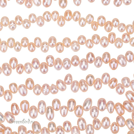 Жемчуг пресноводный культивированный (выращенный) со смещенным отверстием. "Рис", жемчуг овальной или удлиненной формы, вытянутый вдоль отверстия. Может иметь "поясок" или несколько, также обычно имеет заметные поперечные полоски. Размер примерно 7 х 5,5 мм, отверстие: 0,5-0,6 мм. Цвет: светло-персиковый или персиково-розовый. Из-за природных особенностей материала оттенки жемчужин могут незначительно отличаться. Цена указана за нить (примерно 80 штук).