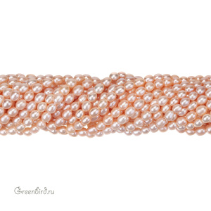 Жемчуг пресноводный культивированный (выращенный). "Рис", жемчуг овальной или удлиненной формы, вытянутый вдоль отверстия. Данный сорт отличается гладкой поверхностью, характерные пояски практически не заметны. Средний размер: 6 х 5 мм, отверстие: 0,5-0,7 мм. Цвет: персиковый или персиково-розовый. Из-за природных особенностей материала размеры и оттенки жемчужин могут незначительно отличаться. Цена указана за нить (примерно 60 штук).