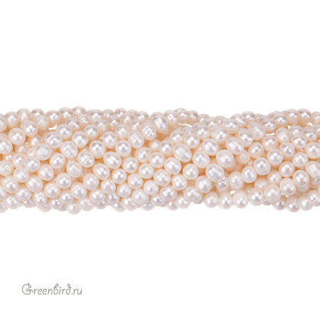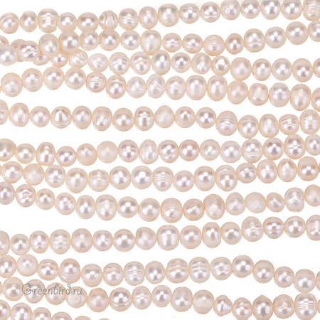 Жемчуг пресноводный культивированный (выращенный). Классическая форма пресноводного жемчуга - почти круглый, овальный или яйцевидный, слегка сплюснутый вдоль отверстия, с характерным "пояском" или небольшими наплывами. Средний размер: 6,5 х 6 мм, отверстие: 0,5-0,6 мм. Форма в основном яйцевидная. Цвет: натуральный жемчужный, нежно-кремовый. Из-за природных особенностей материала размеры и оттенки жемчужин могут отличаться. Цена указана за нить (примерно 63-65 штук).