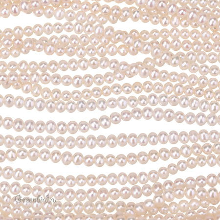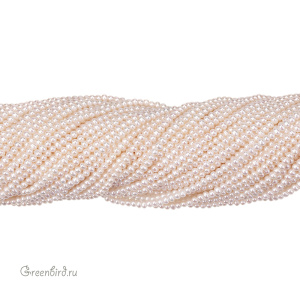 Жемчуг пресноводный культивированный (выращенный). Классическая форма пресноводного жемчуга - почти круглый или яйцевидный. Данный сорт имеет классификацию AAA: идеальная форма, гладкая поверхность, блеск, жемчужины практически идеально повторяют форму друг друга. Средний размер: 2,5 х 3 мм, отверстие: 0,4-0,5 мм. Цвет: натуральный жемчужный, жемчужно-белый. Из-за природных особенностей материала размеры и оттенки жемчужин могут отличаться. Цена указана за нить 40 см (примерно 170 штук).