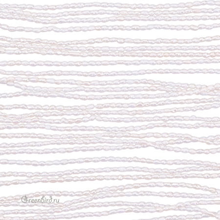 Жемчуг пресноводный культивированный (выращенный). "Рис", жемчуг овальной или удлиненной формы, вытянутый вдоль отверстия. Может иметь "поясок" или несколько, также обычно имеет заметные поперечные полоски. Средний размер: 5 х 3 мм (в длину примерно 4-5 мм, редко до 6 мм, толщина от 2,5 до 3 мм), отверстие: 0,5-0,7 мм. Цвет: молочный, светло-кремовый, кремовый, топленое молоко, редко жемчужно-белый. Из-за природных особенностей материала размеры и оттенки жемчужин могут незначительно отличаться. Цена указана за нить (примерно 82-85 штук).