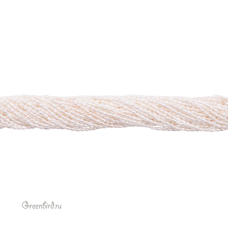 Жемчуг пресноводный культивированный (выращенный). "Рис", жемчуг овальной или удлиненной формы, вытянутый вдоль отверстия. Может иметь "поясок" или несколько, также обычно имеет заметные поперечные полоски. Средний размер: 3 х 2 мм (в длину примерно 2,8-3,3 мм, редко до 4 мм, толщина от 1,8 до 2,2 мм), отверстие: 0,5-0,7 мм. Цвет: молочный, светло-кремовый, кремовый, топленое молоко, редко жемчужно-белый. Из-за природных особенностей материала размеры и оттенки жемчужин могут незначительно отличаться. Цена указана за нить (примерно 112-116 штук).