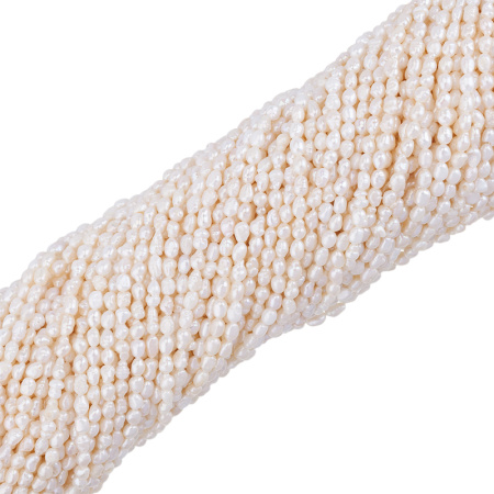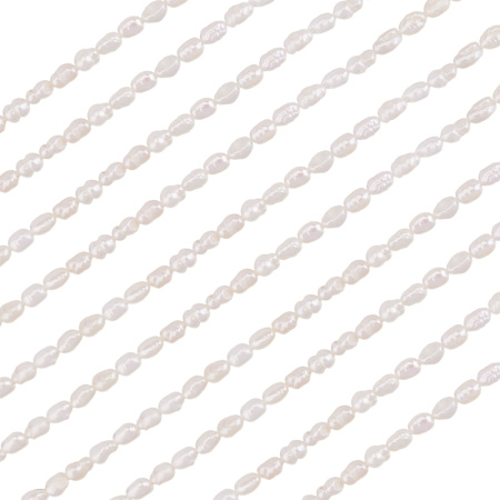 Форма бусин: "Рис" – неоднородные овальные или удлинённые жемчужины, вытянутые вдоль отверстия. Могут иметь один или несколько "поясков", а также характерные поперечные полосы. Средний размер: 6 × 4 мм, диаметр отверстия: 0,8 мм. Цвет: натуральный жемчужный, золотисто-кремовый.