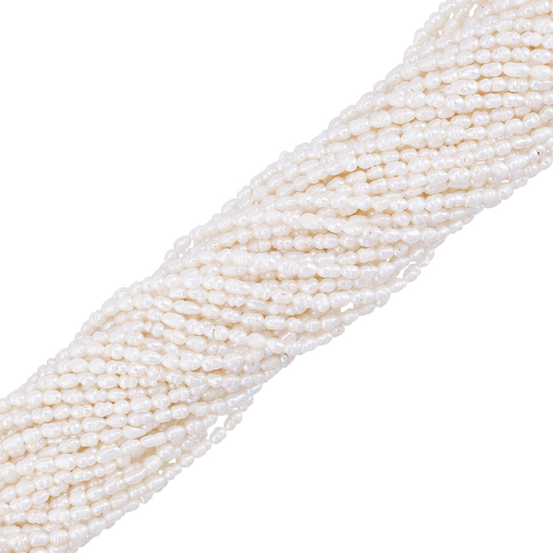 Форма бусин: "Рис" – неоднородные овальные или удлинённые жемчужины, вытянутые вдоль отверстия. Могут иметь один или несколько "поясков", а также характерные поперечные полосы. Средний размер: 5 × 3 мм, диаметр отверстия: 0,8 мм. Цвет: натуральный жемчужный, кремовый.