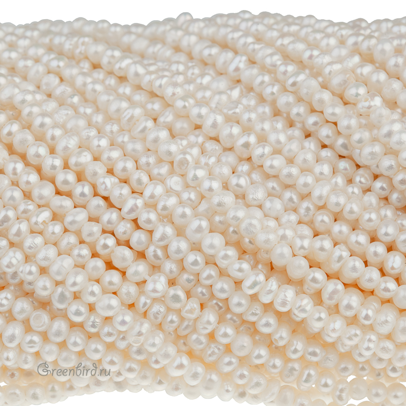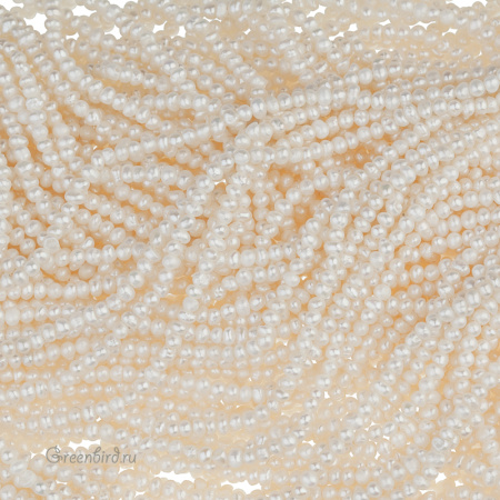 Жемчуг пресноводный культивированный (выращенный). Классическая форма пресноводного жемчуга – почти круглый, овальный или яйцевидный, слегка сплюснутый вдоль отверстия, с характерным "пояском" или небольшими наплывами. Средний размер: 2,4 х 2,6 мм (от 1,7 до 2,7 мм в высоту, в поперечнике примерно 2,4-3 мм), отверстие: 0,5-0,6 мм. Цвет: молочный, бледно-кремовый. Из-за природных особенностей материала размеры и оттенки жемчужин могут отличаться. Цена указана за нить (примерно 160 штук).