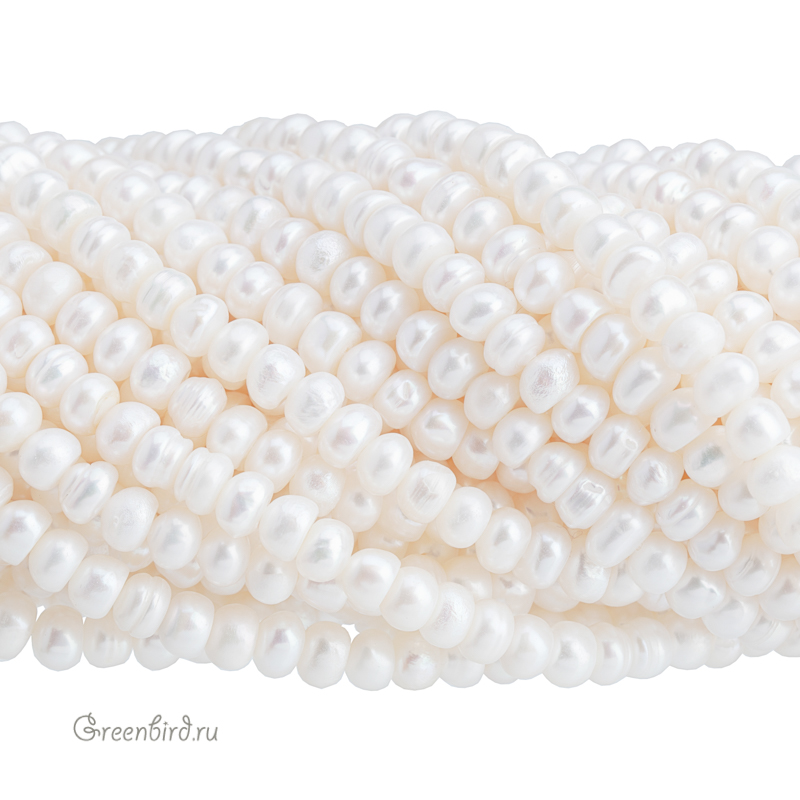 Жемчуг пресноводный культивированный (выращенный). Сплюснутый жемчуг, плоский с одной стороны либо в форме таблеток. Неровный, с хорошо заметными наплывами и поясками. Могут встречаться жемчужины с белыми или светлыми пятнами без блеска. Средний размер: 5 х 3,9 мм (примерно от 5 до 5,9 мм в толщину и от 3,7 до 4 мм в высоту), отверстие: 0,4-0,6 мм. Цвет: светло-молочный, натуральный жемчужный, нежно-кремовый. Из-за природных особенностей материала размеры и оттенки жемчужин могут отличаться. Цена указана за нить (примерно 90 штук).