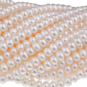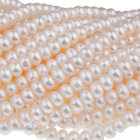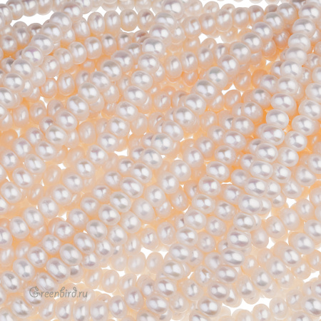 Жемчуг пресноводный культивированный (выращенный). Овальный жемчуг, сплюснутый вдоль отверстия, ровный. Практически не видны полосы или наплывы. Средний размер: 6 х 4,5 мм (примерно от 5,8 до 6,5 мм в диаметре и от 4,2 до 4,7 мм в высоту), отверстие: 0,6-0,7 мм. Цвет: натуральный жемчужный, нежно-кремовый, жемчужно-белый, изредка розоватый; в нити оттенки распределены равномерно, разные нити могут незначительно отличаться. Из-за природных особенностей материала размеры жемчужин могут отличаться. Цена указана за нить (примерно 90 штук).