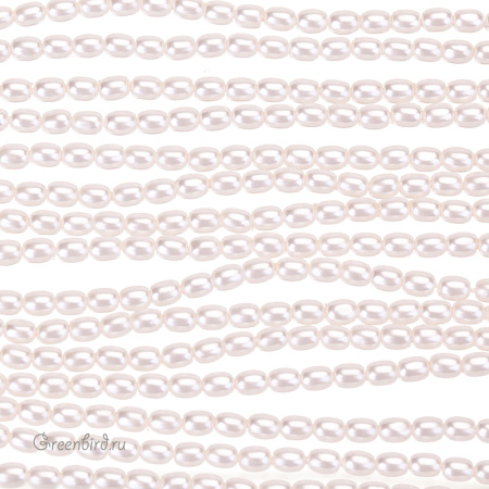 Искусственный жемчуг "Майорка" в форме риса. Жемчуг овальной или удлиненной формы, вытянутый вдоль отверстия. Материал: кристальная бусина-основа, покрытая цветным слоем. Размер: 4 х 3,2 мм, отверстие: 0,6 мм. Цвет: белый, розовато-кремовый. Цена указана за нить 39-40 см (примерно 100 штук).