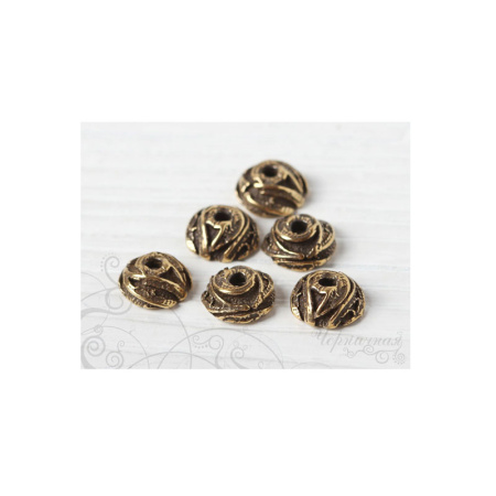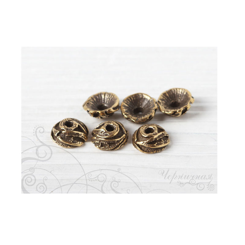 Авторская фурнитура Анны Черных - чашечка для бусины. Размер: 9,1 х 4,1 мм, внутренний диаметр примерно 6,4 мм, отверстие: 1,7-1,9 мм. Материал: античная латунь. Производство: Россия. Цена указана за 1 шт.