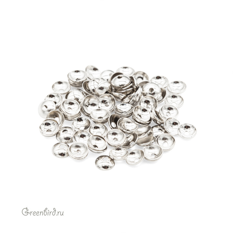 Фурнитура для бижутерии - шапочка для бус и шнуров гладкая. Материал: латунь, покрытие: родий. Диаметр: 4,0-4,1 мм, высота: 1,2 мм, отверстие: 0,8 мм. Подходит для бусин диаметром примерно 3,2 мм. Производство: Китай. Цена указана за упаковку (100 штук).