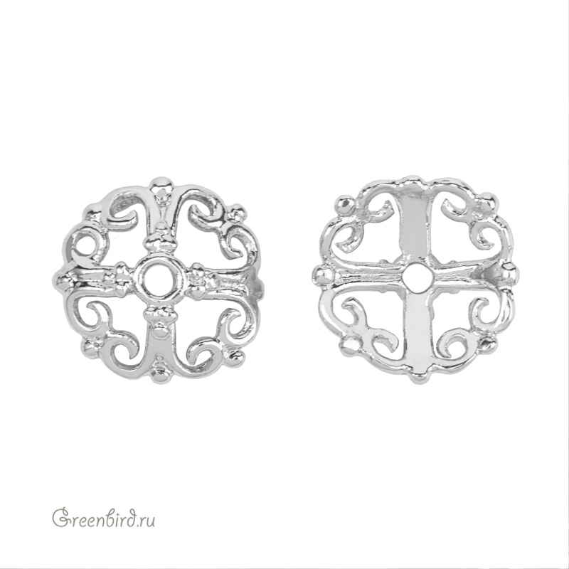 Фурнитура для бижутерии - ажурная шапочка для бус и шнуров со средневековым узором. Материал: латунь, покрытие: родий. Размер: 9,5 х 3 мм, максимальный внутренний диаметр: 7,5 мм, диаметр отверстия: 1,1 мм. Производство: Китай. Цена указана за 1 шт.