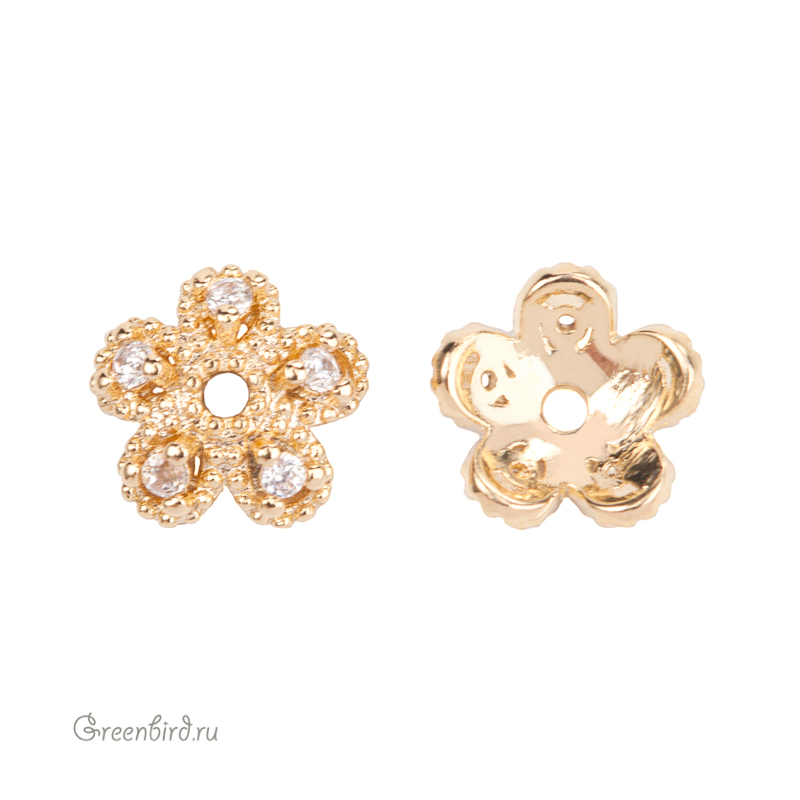 Фурнитура для бижутерии - ажурная шапочка для бус и шнуров с фианитами. Материал: латунь, покрытие: золото. Размер: 7,2 х 2,5 мм, максимальный внутренний диаметр: 5,4 мм, диаметр отверстия: 1 мм. Производство: Китай. Цена указана за 1 шт.