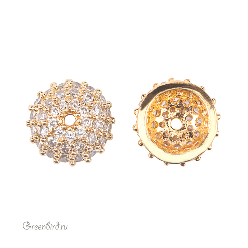Фурнитура для бижутерии - шапочка для бус и шнуров с фианитами. Материал: латунь, покрытие: светлое золото. Размер: 8,5 х 3,1 мм, максимальный внутренний диаметр: 5,6 мм, диаметр отверстия: 0,6 мм. Производство: Китай. Цена указана за 1 шт.