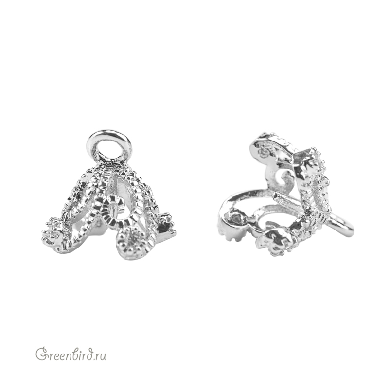 Фурнитура для бижутерии - ажурная шапочка-конус для вклеивания с гладким штырьком. Материал: латунь, покрытие: родий. Размер шапочки с петелькой: 10 х 9,5 мм, длина штырька: 4 мм, толщина штырька: 0,9 мм. Производство: Китай. Цена указана за 1 шт.