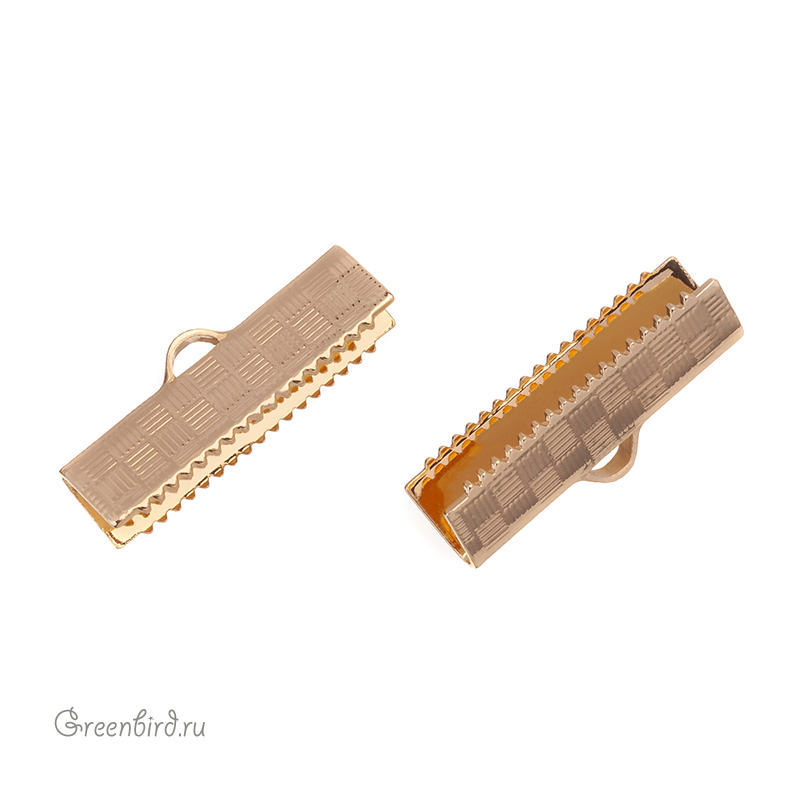 Фурнитура для бижутерии - зажимной концевик с зубчиками для бисерного полотна, плетеных фенечек, лент. Материал: латунь, покрытие: золото. Размер: 20 х 5,6 мм, петелька: 2,6 х 1,3 мм. Производство: Китай. Цена указана за 1 штуку.