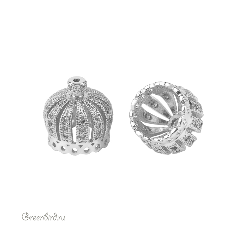 Фурнитура для бижутерии - концевик для шнура или кисти с петельками по внешнему краю для закрепления дополнительных нитей, украшенный фианитами. Материал: латунь, покрытие: родий. Размер: 13 х 13,2 мм, внутренний диаметр: 9,8 мм, внутренний диаметр краевых петель: 0,8 мм. Производство: Китай. Цена указана за 1 шт.