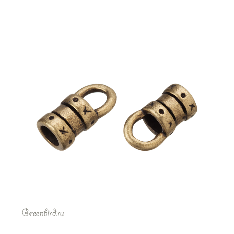 Наконечник-кримп - концевик для шнура, размер: 11,2 х 5,1 х 6 мм; отверстие: 3,4 мм. Цвет: античная латунь. Производство: Израиль. Цена указана за 1 штуку.