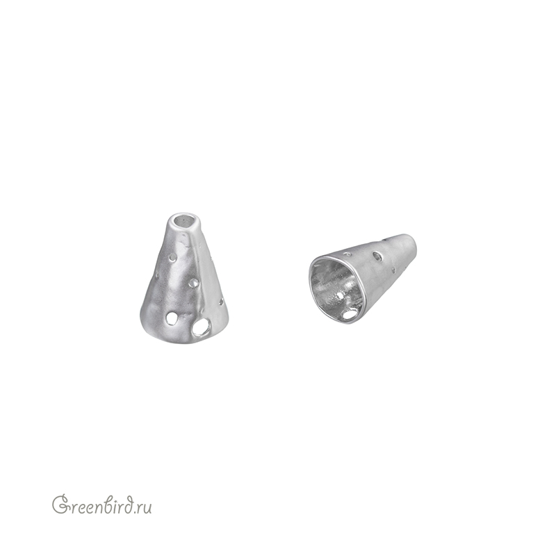 Фурнитура для бижутерии - концевик-конус для шнура с декоративными отверстиями. Материал: латунь, покрытие: матовый родий. Покрытие может иметь потертости и царапины. Размер: 10,2 х 14,2 мм, внутренний размер: 8,5 х 9 мм, отверстие: 2,1 мм, декоративные отверстия: от 0,4 до 1,7 мм. Производство: Корея. Цена указана за 1 шт.