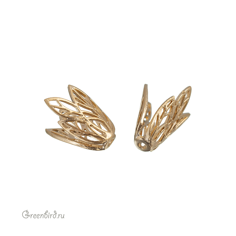 Фурнитура для бижутерии - декоративная ажурная шапочка для бусин с вертикальным отверстием или для плоских подвесок. Материал: латунь, покрытие: матовое золото. Общий размер: 9,3 х 14 мм, толщина в сомкнутом состоянии: 4,7 мм, минимальная внутренняя ширина: 3,6 мм, отверстие: 1,6 мм. Производство: Корея. Цена указана за 1 шт.