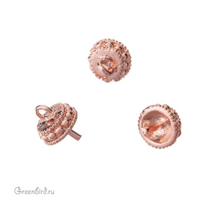 Фурнитура для бижутерии - компонент для вклеивания полупросверленного жемчуга. Материал: латунь, покрытие: розовое золото. Размер декоративного элемента: 5,5 х 4,6 мм, длина штырька: 3,3 мм, толщина штырька: 0,8 мм. Подходит для жемчуга 6, 8 и 10 мм. Производство: Корея. Цена указана за 1 штуку.