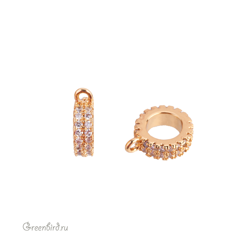 Фурнитура для бижутерии - коннектор-бейл в форме рондели с фианитами. Материал: латунь, покрытие: золото. Размер декоративного элемента: 3,1 х 9,2 мм, высота с колечком: 11,3 мм, внутренний диаметр рондели: 2,6 мм, внутренний размер колечка: 1,3 мм. Производство: Китай. Цена указана за 1 шт.