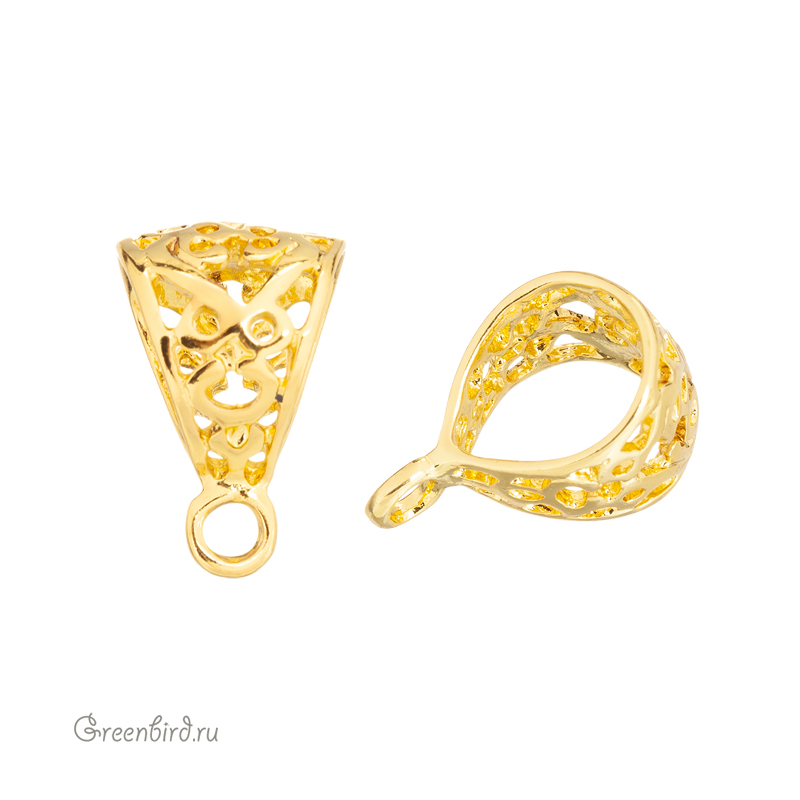 Фурнитура для бижутерии - классический объемный коннектор-бейл с ажурным узором, с запаянным колечком. Подходит для объемных шнуров и небольших жгутов. Материал: латунь, покрытие: яркое золото. Размер с колечком: 10,8 х 17 мм, отверстие: 7,6 х 9,7 мм, внутренний диаметр колечка: 2,4 мм. Производство: Китай. Цена указана за 1 шт.