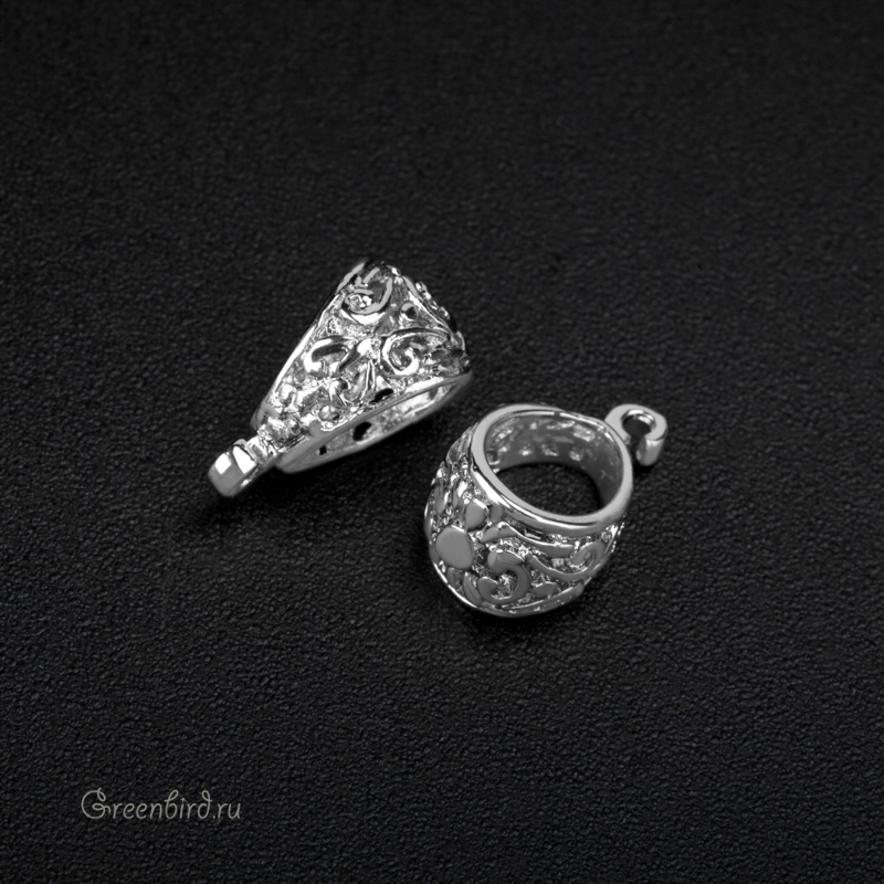 Фурнитура для бижутерии - классический объемный коннектор-бейл с ажурным узором, с незапаянным колечком. Подходит для объемных шнуров и небольших жгутов. Материал: латунь, покрытие: родий. Размер с колечком: 7,9 х 13,4 мм, отверстие: 6,5 х 8,2 мм, внутренний диаметр колечка: 1,3 мм. Производство: Китай. Цена указана за 1 шт.