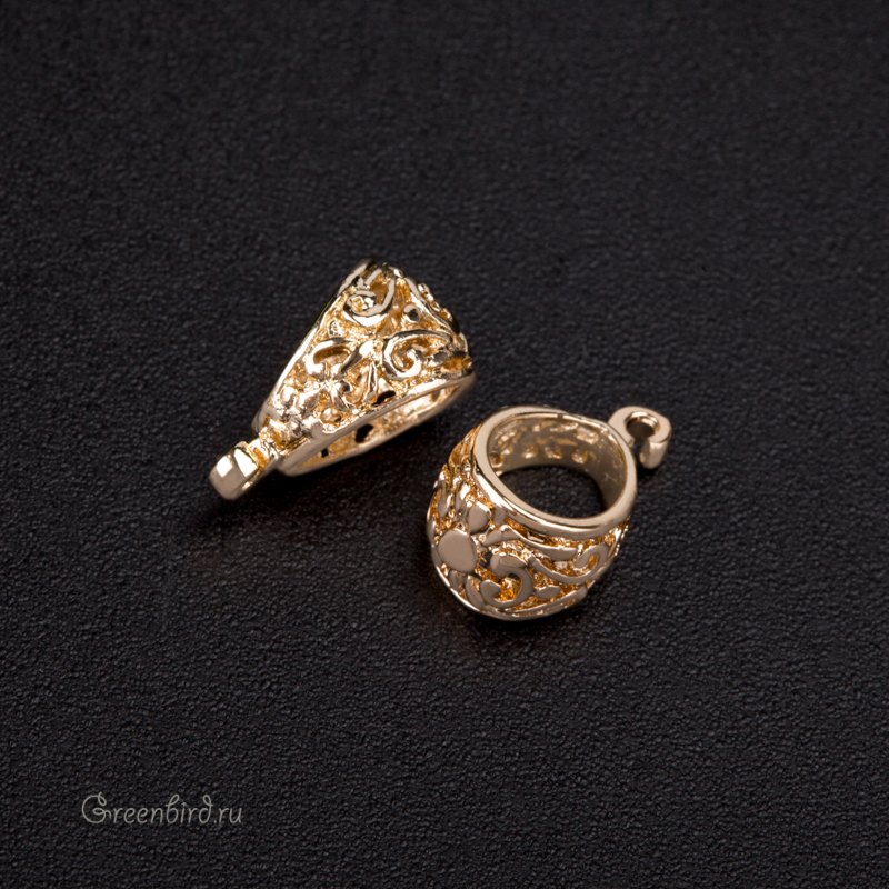 Фурнитура для бижутерии - классический объемный коннектор-бейл с ажурным узором, с незапаянным колечком. Подходит для объемных шнуров и небольших жгутов. Материал: латунь, покрытие: золото. Оттенок покрытия может незначительно отличаться. Размер с колечком: 7,9 х 13,4 мм, отверстие: 6,5 х 8,2 мм, внутренний диаметр колечка: 1,3 мм. Производство: Китай. Цена указана за 1 шт.