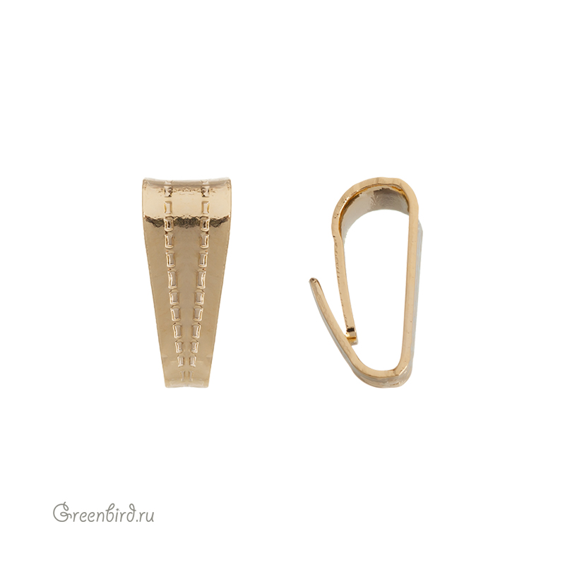 Фурнитура для бижутерии - бейл разъемный (держатель для подвески в виде незапаянной скобки), с плоской передней стороной и неплотно прилегающей скобкой сзади. Материал: латунь, покрытие: золото. Размер: 4,3 х 10,5 х 5,6 мм, ширина в нижней части: 2,6 мм, внутренний размер: 3 х 8,4 мм. Производство: Корея. Цена указана за 1 штуку.