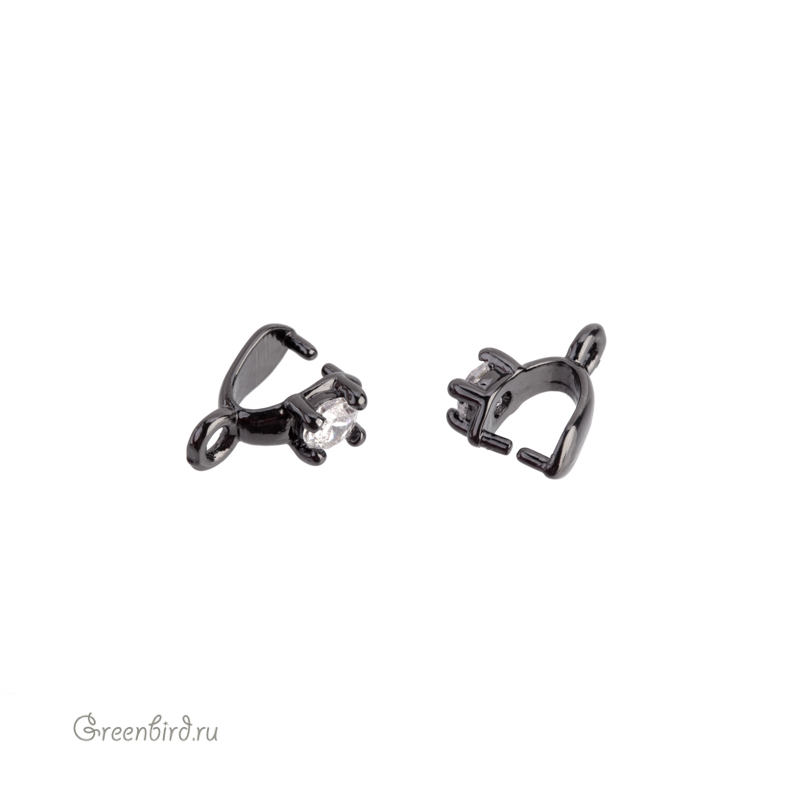 Фурнитура для бижутерии - бейл-зажим, с одной стороны украшенный фианитом. Материал: латунь, покрытие: gunmetal (оружейная сталь). Размер зажима: 3,6 х 7 х 6,8 мм, высота с колечком: 9,6 мм, внутренний размер колечка: 1,4 мм, толщина штырьков: 0,7 мм. Производство: Китай. Цена указана за 1 шт.