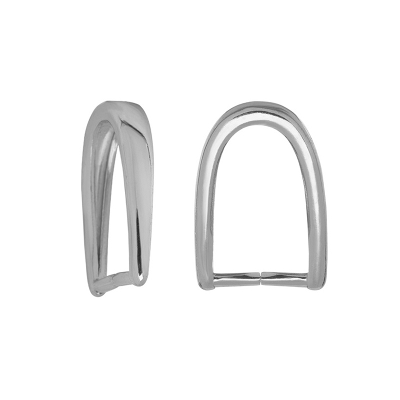 Фурнитура для бижутерии — бейл-зажим для кулона. Материал: латунь, цвет покрытия: родий. Общий размер: 12,5 х 9 х 2,5 мм, размер штырьков: 4 x 0,9 мм. Производство: Китай. Цена указана за 1 шт.