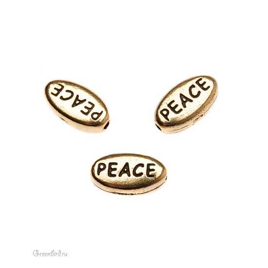 Металлическая бусина овальная вытянутая со словом "Peace". Цвет: античное золото. Размер: 11 х 6 х 3 мм, отверстие: 0,9 мм. Цена указана за 1 шт.