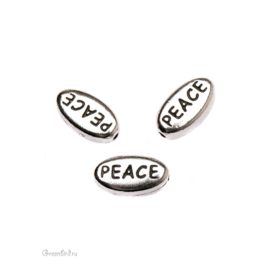 Металлическая бусина овальная вытянутая со словом "Peace". Цвет: античный родий (родий с чернением). Размер: 11 х 6 х 3 мм, отверстие: 0,9 мм. Цена указана за 1 шт.