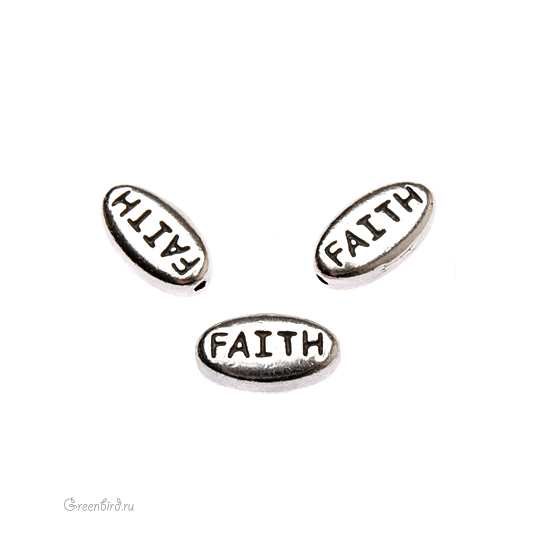 Металлическая бусина овальная вытянутая со словом "Faith". Цвет: античный родий (родий с чернением). Размер: 11 х 6 х 3 мм, отверстие: 0,9 мм. Цена указана за 1 шт.