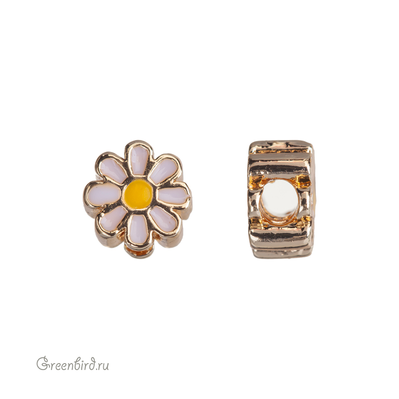 Металлическая бусина двусторонняя с эмалью в виде цветка. Материал: латунь, покрытие: золото. Цвет эмали: белый, желтый. Размер: 4,5 х 5,5 мм, толщина: 3,3 мм, диаметр отверстия: 1,7 мм. Производство: Китай. Цена указана за 1 шт.