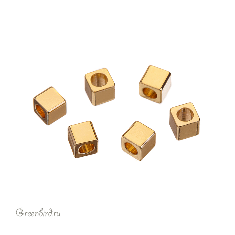 Металлическая гладкая бусина в форме куба. Материал: латунь, покрытие: золото. Размер: 3 мм, отверстие: 1,9 мм. Производство: Китай. Цена указана за 1 шт.